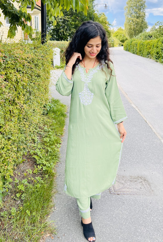 Divine Drapes - Rayon Chikankari Green Kurti Pajama