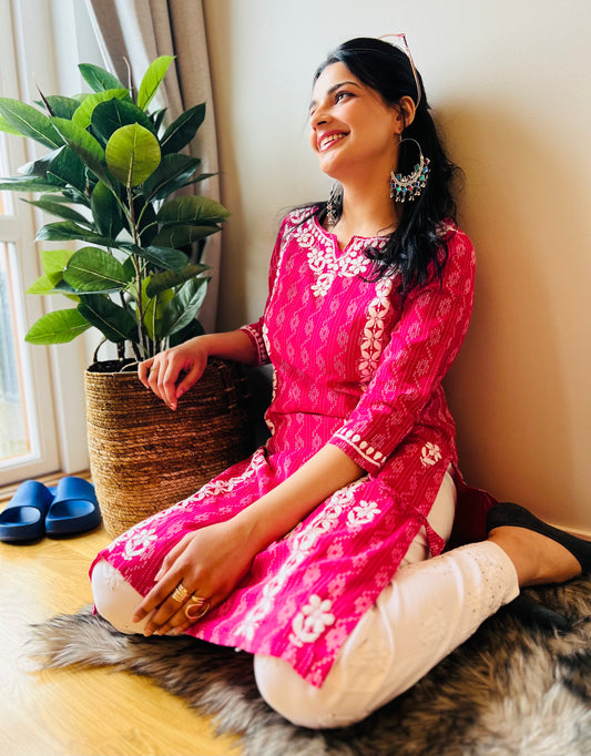 Elegant Ensemble - Printed Handcrafted Chikankari Kurti with 3/4th Sleeves