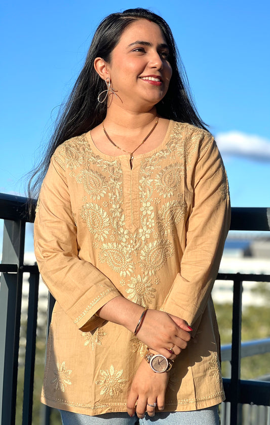 Monsoon Magic - Brown Cotton Hand-Embroidered Chikankari Short Top