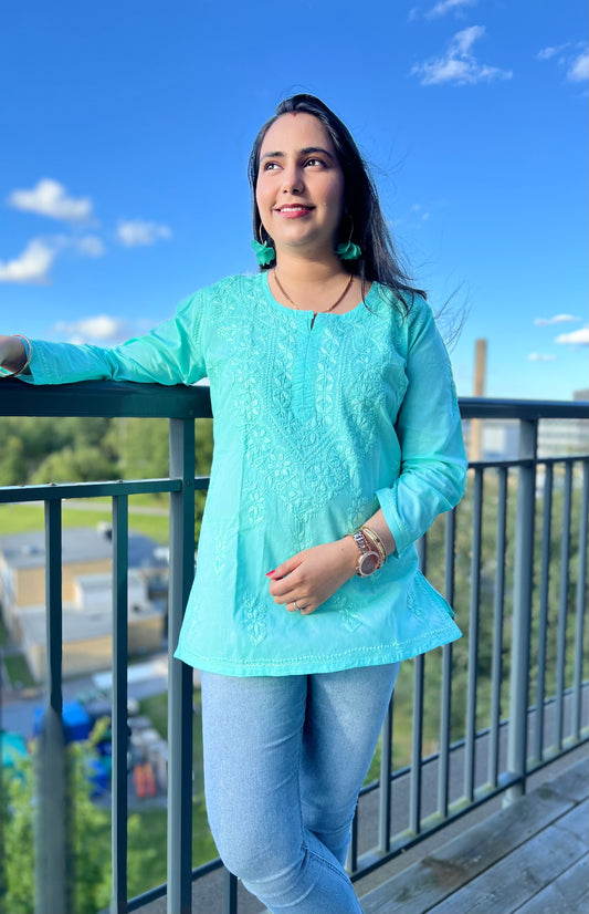 Monsoon Magic - Sea Green Cotton Hand-Embroidered Chikankari Short Top